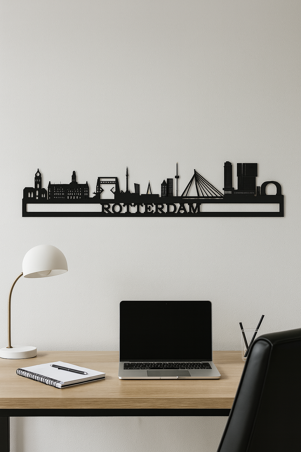 De skyline is gebaseerd op herkenbare gebouwen en karakteristieke vormen van de gekozen stad (bijv. gebouwen uit Rotterdam), waardoor het direct associaties oproept met jouw woonplaats of favoriete stad.Minimalistisch & modern: